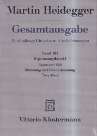 Heidegger, Martin: Raum und Zeit. Stimmung und Grundstimmung. Über Marx. Frankfurt/Main: Vittorio Klostermann 2025. 8°. XXIII, 312 S., kartoniert (sehr gut erhalten) (=Gesamtausgabe, Band 103; 4. Abteilung, Hinweise und Aufzeichnungen; Ergänzungsband / herausgegeben von Peter Trawny; 1) Eine 2015/16 vorgenommene neue Sichtung des Heidegger-Nachlasses durch eine kleine Gruppe von Wissenschaftlern (Klaus Held, Michael Ruppert und Peter Trawny) zusammen mit dem Nachlassverwalter Arnulf Heidegger, in deren Verlauf der Nachlass Martin Heideggers auf eventuell noch vorhandene politisch problematische Manuskripte hin durchsucht werden sollte, ergab, dass sich noch einige Manuskripte im Nachlass befanden, die ihre Herausgabe nahelegten. Daraufhin wurde die Entscheidung getroffen, die Gesamtausgabe über den ursprünglichen, auf 102 Bände angelegten Editionsplan hinaus zu erweitern. Das betreffende Material wird nun in drei Ergänzungsbänden zur Gesamtausgabe mit den Bandnummern 103, 104 und 105 vorgelegt. Der erste der drei Bände (HGA 103) enthält Aufzeichnungen zu Raum und Zeit, zur Stimmung und zu Karl Marx, die zwischen 1930 und 1940 entstanden sind. Der zweite Band (HGA 104) bringt Gespräche und bisher unveröffentlichte Handschriften zu einem in seinen Ausmaßen noch unentdeckten Projekt der Vier Hefte (GA 104) aus den Jahren 1937 bis ca. 1950. Der dritte Band (HGA 105) wird dann voraussichtlich im Frühjahr 2026 die Gesamtausgabe mit der Veröffentlichung des letzten großen Manuskripts Martin Heideggers aus den Siebzigerjahren, dem Vermächtnis der Seinsfrage, beschließen. Teilweise beziehen sich die Aufzeichnungen auf schon veröffentlichte Schriften und vervollständigen so das vorliegende Werkgewebe des Denkers. Teilweise aber kommen auch Texte zum Vorschein, die selbst noch nach einer über 100 Jahre sich erstreckenden Veröffentlichungsgeschichte Heidegger’scher Philosophie neue Wege des Denkens präsentieren. Sie bestätigen allesamt das Motto, das den ersten Band der Gesamtausgabe eröffnet: Wege nicht Werke.