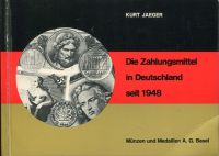 Jaeger, Kurt: Die Zahlungsmittel in Deutschland seit 1948. Münzen und Banknoten mit Bewertungen. Basel: Münzen und Medaillen 1972. quer-12°. 224 S., zahlreiche sw-Abbildungen, broschiert (leicht bestossen; sonst gut erhalten)