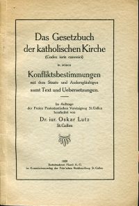 Lutz, Oskar: Das Gesetzbuch der katholischen Kirche (Codex iuris canonici) in seinen Konfliktsbestimmungen mit dem Staate und Andersgläubigen samt Text und Übersetzungen. Im Auftrag der Freien Protestantischen Vereinigung St. Gallen bearbeitet. St. Gallen: Fehr’sche Buchhandlung 1929. 8°. 64 S., broschiert (Papier altersbedingt leicht gebräunt; altersgemäss gut erhalten)