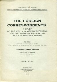 Kruglack, Theodore Edward: The Foreign Correspondents. A Study of the Men and Women reporting for the American Information Media in Western Europe. Genève: E. Droz 1955. 8°. 163 S, Anhang, Glossar, Bibliographie, broschiert (Papier gebräunt; Rücken abgedunkelt) (Diss. Genève)