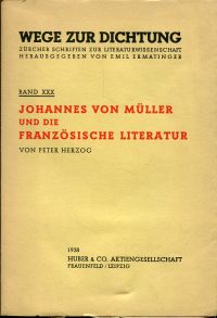Herzog, Peter: Johannes von Müller und die französische Literatur. Frauenfeld: Huber 1938. gr. 8. 301 S., broschiert (Papier leicht gebräunt; Schutzumschlag teilweise leichte Randläsuren; leicht angestaubt; sonst gut erhalten) (=Wege zur Dichtung ; Bd. 30)