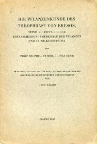 Senn, Gustav: Die Pflanzenkunde des Theophrast von Eresos. Seine Schrift über die Unterscheidungsmerkmale der Pflanzen und seine Kunstprosa. Im Auftrag der Universität Basel aus den nachgelassenen Druckbogen hrsg. und eingeleitet von Olof Gigon. Basel: Universität 1956. Gr.-8°. XXI, 123 S., broschiert (Einband licht lichtrandig; eine Ecke leicht bestossen; sonst gut erhalten)