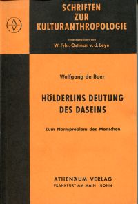 Boer, Wolfgang de: Hölderlins Deutung des Daseins. Zum Normproblem des Menschen. Frankfurt a.M./Bonn: Athenäum 1961. Gr.-8°. 171 S., broschiert (Ex Libris auf Innendeckel; Einband hinten leicht berieben; sonst gut erhalten) (=Schriften zur Kulturanthropologie ; Bd. 4)