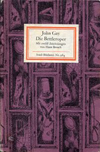 Gay, John: Die Bettleroper. Übertragen von Hans Magnus Enzensberger. Mit einem dokumentarischen Anhang. 1. Aufl. Leipzig: Insel 1973. 8°. 124 S., 12 Zeichnungen von Hans Brosch, Pappband (gut erhalten) (=Insel-Bücherei, 984)
