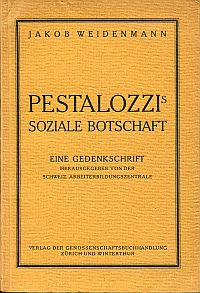 Weidenmann, Jakob: Heinrich Pestalozzis soziale Botschaft. Eine Gedenkschrift zum hundertsten Todestag am 17. Februar 1927. Im Auftrag der schweizer. Arbeiterbildungszentrale. Zürich: Verlag der Genossenschaftsbuchhandlung 1927. Gr.-8°. 118 S., Porträt auf Frontispiz. broschiert (leicht stockfleckig; leicht angestaubt; altersgemäss gut erhalten)