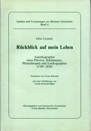 Carisch, Otto/Brunold, Ursus [Bearb.]: Rückblick auf mein Leben. Autobiographie eines Pfarrers, Schulmanns, Philanthropen und Lexikographen (1789 – 1858). Chur, Verl. Bündner Monatsbl, 1993. 8°. XVII, 328 S., sw-Abbildungen, Leinen (gut erhalten) (=Quellen und Forschungen zur Bündner Geschichte ; Bd. 4)