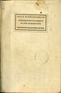 Schachermeyr, Fritz: Lebensgesetzlichkeit in der Geschichte. Versuch einer Einführung in das geschichtsbiologische Denken. Frankfurt/Main: Klostermann (1940). 8°. 240 S., Pappband in Cellophaneinfassung (Bibliotheksexemplar; mehrere Bibliotheksvermerke und Stempel in Titelei; Schnitt stockfleckig; Ex Libris auf Innendeckel; Seiten teilweise leicht wasserwellig ohne Textverlust; Einbandecken bestossen) Schachermeyr wird mit Grund als „einer der profiliertesten Nationalsozialisten unter den Historikern“ bezeichnet. Seit der Übernahme der Professur in Jena 1931 begann er sich politisch für die NSDAP zu betätigen und war nach eigenen Angaben Mitbegründer des „Nationalsozialistischen Kampfringes der Deutschösterreicher im Reich“, dessen Gauleiter von Thüringen er 1933 wurde.