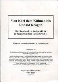 Anderes, Dominic u.a. (Hrsg.): Von Karl dem Kühnen bis Ronald Reagan. Fünf Jahrhunderte Weltgeschichte in Zeugnissen ihrer Hauptdarsteller. Katalog der Autographensammlung „Dr. Georg Heberlein“. 2. Aufl. Bern: Eidgenössische Militärbibliothek und Historischer Dienst 1999. 4°. 384 S., zahlreiche sw-Abbildungen, broschiert (gut erhalten)