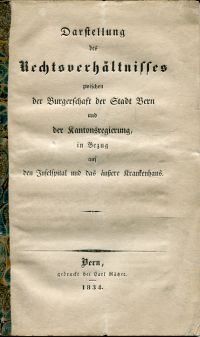 Darstellung des Rechtsverhältnisses zwischen der Burgerschaft der Stadt Bern und der Kantonsregierung, in Bezug auf den Inselspital und das äussere Krankenhaus. Bern: Carl Rätzer 1834. 8°. 31 S., broschiert (altersgemäss gut erhalten)