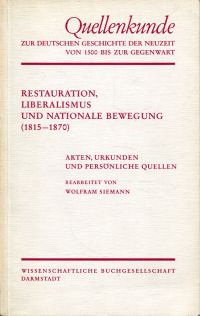 Siemann, Wolfgang: Restauration, Liberalismus und nationale Bewegung. (1815 – 1870) ; Akten, Urkunden und persönliche Quellen. Darmstadt: Wissenschaftliche Buchgesellschaft 1982. 8°. X, 225 S., broschiert (Einband leicht angebräunt; Anstreichungen) Quellenkunde zur deutschen Geschichte der Neuzeit von 1500 bis zur Gegenwart / hrsg. von Winfried Baumgart ; 4.