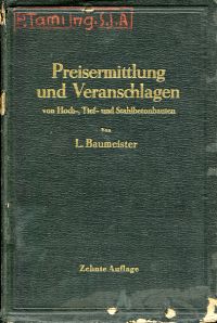 Baumeister, Ludwig: Preisermittlung und Veranschlagen von Hoch-, Tief- und Stahlbetonbauten. Ein Hilfs- und Nachschlagebuch zum Veranschlagen von Erd-, Strassen-, Wasser- und Brücken-, Stahlbeton-, Maurer- und Zimmerarbeiten. 10., neubearbeitete Aufl. Berlin: Springer 1950. Gr.-8°. VIII, 508 S., 143 Abbildungen, Leinen (Besitzervermerk auf Vorsatz und Einband; Stempel auf Titelblatt; Einband stark beschabt)