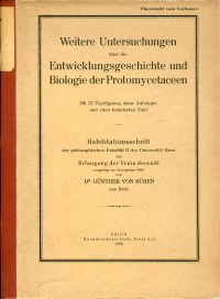 Büren, Günther von: Weitere Untersuchungen über die Entwicklungsgechichte und Biologie der Protomycetaceen. Zürich: Fretz 1922. Gr.-8°. 94 Textseiten, 27 Textfiguren, 2 kommentierte Bildtafeln, Halbleinen (Bibliotheksexemplar; Stempel auf Titelblatt; gut erhalten) (=Habilitationsschrift Bern 1921).