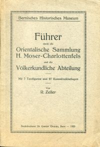 Zeller, Rudolf: Führer durch die orientalische Sammlung H. Moser-Charlottenfels und die Völkerkundliche Abteilung. Bern: Grunau 1923. 8°. 78 S., 7 Textfiguren und 27 Kunstdruckbeilagen, broschiert Bibliotheksexemplar; Bibliotheksstempel und -vermerke; leicht bestossen; sonst altersgemäss gut erhalten)
