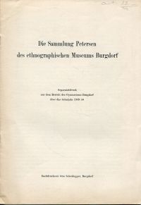 Ethnographische Sammlung Burgdorf. Die Sammlung Petersen des ethnogaphischen Museums Burgdorf. Burgdorf: Scheidegger 1949. 8°. 8 S., 4 Tafeln, geheftet (Papier altersbedingt leicht gebräunt; gut erhalten) (=Separatabdruck aus: Bericht des Gymnasiums Burgdorf über das Schuljahr 1949/50)