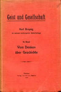 Geist und Gesellschaft. Kurt Breysig zu seinem sechzigsten Geburtstage Bd. 3: Vom Denken über Geschichte. Breslau: Marcus 1928. Gr.-8°. 215 S., broschiert (private Widmung auf Vorsatz; Seiten nicht beschnitten; Rücken angebräunt; Papier altersbedingt leicht gebräunt; altersgemäss gut erhalten)