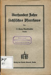 Blanckmeister, Franz: Vierhundert Jahre sächsisches Pfarrhaus. Berlin: Warneck 1929. 8°. 58 S., broschiert Bibliotheksexemplar; Stempel auf Titelblatt; Bibliotheksvermerke; Seiten teilweise nicht beschnitten; altersgemäss gut erhalten) (=Studien zur Geschichte des evangelischen Pfarrerstandes, 4)