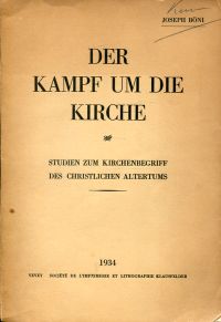 Böni, Jakob: Der Kampf um die Kirche. Studien zum Kirchenbegriff des christlichen Altertums. Vevey: Klausfelder 1934. Gr.-8°. 326 S. broschiert (Papier gebräunt; Einband mit Gebrauchsspuren; sonst altersgemäss gut erhalten)