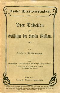 Bornemann, Wilhelm: Vier Tabellen zur Geschichte der Basler Mission. Basel: Verl. der Missionsbuchh. 1902. 16 S. (Umschlag mit kleinen Einrissen und abgegriffen) (=Basler Missionsstudien, 11) Text in Fraktur.