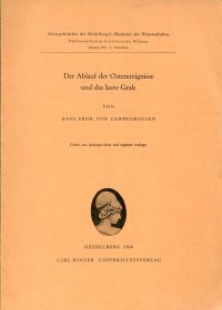 Campenhausen, Hans von: Der Ablauf der Osterereignisse und das leere Grab. 3., neu durchgesehene u. ergänzte Aufl. Heidelberg: C. Winter 1966. Gr.-8°. 67 S., broschiert (Umschlag leicht angestaubt; sonst gut erhalten) (=Sitzungsberichte der Heidelberger Akademie der Wissenschaften, Philosophisch-Historische Klasse, Jg. 1952, 4. Abh.)