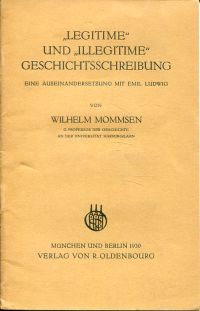 Mommsen, Wilhelm: „Legitime“ und „illegitime“ Geschichtsschreibung. Eine Auseinandersetzg mit Emil Ludwig. München, R. Oldenbourg, 1930. 8°. 21 S., geheftet (Umschlag leicht angestaubt; Papierbedingt leicht gebräunt; altersgemäss gut erhalten) (=Aus: Zeitwende. Jg. 5. 1929. H. 10)