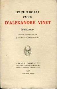 Vinet, Alexandre: Les plus belles pages d’Alexandre Vinet. Édification. Choix et introduction par J. de Mestral Combremont. 2ième tirage. Lausanne: Payot 1932. 8°, 212 S., broschiert (Umschlag angestaubt; Seiten nicht beschnitten)
