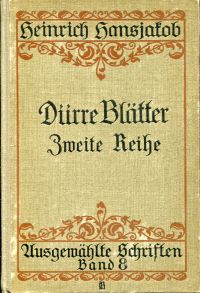 Hansjakob, Heinrich: Ausgewählte Schriften, Band 8: Dürre Blätter, 2. Reihe. Volksausgabe. Stuttgart: A. Bonz 1911. 8°. 298 S., Pappband mit umlaufendem Farbschnitt. (Ex Libris auf Innendeckel; Einband berieben; von privat montierte Abbildungen auf Vorsatz)