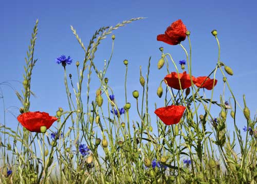 bildreich karten PK 1004: himmelwaerts. Querformat. (Mohn, Klatschmohn, Kornblume, Feld, Feldrand, Strassenrand, Himmel)