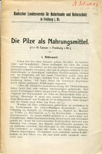 Caesar, Hermann: Die Pilze als Nahrungsmittel. Freiburg i. Br.: Badischer Landesverein für Naturkunde und Naturschutz 1917. 8°. 24 S., Broschiert (Besitzervermerk auf Titelblatt; Papier altersbedingt leicht gebräunt; wenig abgegriffen)