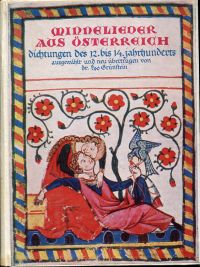 Grünstein, Leo: Minnelieder aus Österreich. Dichtungen dem 12.-14. Jahrhundert. Mit einem Anhang der mittelhochdeutschen Texte. Wien: Österr. Verlagsgesellschaft 1921. 8°. 155 S., mit montierten Farbabbildungen, Pappband (Besitzervermerk auf Vorsatz; Ex Libris auf Innendeckel; Papier altersbedingt leicht gebräunt; Rücken teilweise befleckt; sonst altersgemäss gut erhalten)
