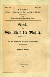 Vetter, Theodor (Hrsg.): Chronick der Gesellschaft der Mahler. 1721-1722. Nach den Manuscripte der Zürcher Stadtbibliothek. Frauenfeld: J. Huber’s Verlag 1887. VIII, 117 S. broschiert (neuer Einband; Papier leicht gebräunt) (=Bibliothek aelterer Schriftwerke der deutschen Schweiz, Serie 2/Heft 1).
