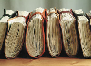 bildreich karten PK 112: tagebücher I. Querformat. 2004. (Skizzenbücher, Notizbücher, Notizen, Tagebücher, Tagebuch) Mindestbestellmenge: 15 Karten (auch assortiert).
