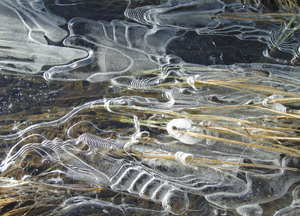 bildreich karten PK 202: eiswellen I. Querformat. 2005. (Schwarzeis, Eis, Wellen, Bach, Bergbach, Zeit) Mindestbestellmenge: 15 Karten (auch assortiert).