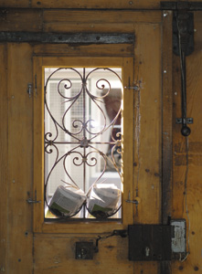 bildreich karten PK 219: sonntagmorgen. Hochformat. 2006. (Türe, Haustüre, Eingang, Fenster, Zeitung, Schmiedeisen, Ornament, Neumarkt, Holz) Mindestbestellmenge: 15 Karten (auch assortiert).