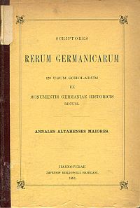 Annales Altahenses maiores. Editio altera recognovit Edmundus L. B. ab Oefele. Hannoverae: Hahn 1891. 8°. XXI, 105 S., Halbleinen (Bibliotheksexemplar; Bibliotheksvermerke; Stempel auf Titelblatt; Einband mit Gebrauchsspuren und angestaubt; Papier altersbedingt leicht gebräunt) (=Monumenta Germaniae Historica; [Scriptores]; [7], Scriptores rerum Germanicarum in usum scholarum separatim editi, [4])