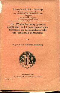Bückling, Gerhard: Die Wechselwirkung gewererechtlicher und fronungsrechtlicher Elemente im Liegenschaftsrecht des deutschen Mittelalters. Heidelberg: Winter 1911. S. 97 – 215, Broschiert (Seiten nicht beschnitten; Einband wenig befleckt; altersgemäss gut erhalten) (=Deutschrechtliche Beiträge, 6,2)