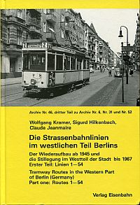 Kramer, Wolfgang: Die Strassenbahnlinien im westlichen Teil Berlins. der Wiederaufbau ab 1945 und die Stillegung im Westteil der Stadt bis 1967; erster Teil: Linien 1 – 54 = Tramway routes in the Western part of Berlin. Villigen: Verl. Eisenbahn 1986. 8°. [Ca. 250] S., durchgehend sw-Abbildungen, Pappband (Einband mit leichten Gebrauchsspuren; gut erhalten) (=Archiv, 46)