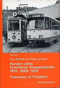 Michelke, Horst: Hundert Jahre Frankfurter Strassenbahnen. 1872 – 1899 – 1972 = Tramways of Frankfurt am Main (Western Germany). Villigen: Verlag Eisenbahn 1972. 8°. 32, [192] S. 346 sw-Abbildungen und Skizzen, Leinen (Stempel auf Vorsatz; gut erhalten) (=Archiv, Nr. 18)
