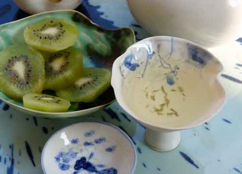 bildreich karten PK 653: tee bei yafang I. Querformat. (Obst, Kiwi, Porzellan, Chinesisch, Japanisch, Grüntee, Tee, Pause) Mindestbestellmenge: 15 Karten (auch assortiert).