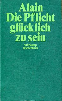 Alain: Die Pflicht, glücklich zu sein. Frankfurt/Main: Suhrkamp 1982. 8°. 231 S., Broschiert (Papierbedingt leicht gebräunt; gut erhalten) (=Suhrkamp Taschenbuch, 859)