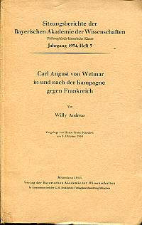 Andreas, Willy: Carl August von Weimar in und nach der Kampagne gegen Frankreich. München: Verl. der Bayer. Akad. der Wiss. 1955. 8°. 71 S., Broschiert (Einband mit leichten Gebrauchsspuren; sonst gut erhalten) (=Sitzungsberichte der Bayerischen Akademie der Wissenschaften, Philosophisch-Historische Klasse, 1954,5)