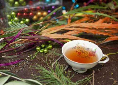 bildreich karten PK 980: adventstee. Querformat. (Teetasse, Florist, Dekoration, Zweige, Arbeitstisch, Tee)