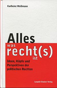 Weißmann, Karlheinz: Alles was recht(s) ist. Ideen, Köpfe und Perspektiven der politischen Rechten. Graz/Stuttgart: Stocker 2000. 8°. 284 S., Pappband (Besitzervermerk auf Vorsatz; Ex Libris auf Innendeckel; gut erhalten)
