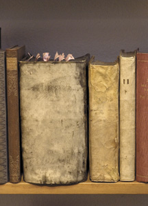 bildreich karten PK 293: wiedergefunden. Querformat. 2007. (Alte Bücher, Pergament, Post-it, Bücherregal, Tablar) Mindestbestellmenge: 15 Karten (auch assortiert).
