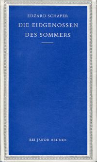 Schaper, Edzard: Die Eidgenossen des Sommers. Köln, Olten: Hegner (1958). 8°. 62 S. Leinen (Besitzervermerk auf Vorsatz; Ex Libris auf Innendeckel; gut erhalten)