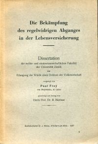 Frey, Paul: Die Bekämpfung des regelwidrigen Abganges in der Lebensversicherung. Affoltern a.A.: Buchdruckerei J. Weiss 1937. Gr.-8°. XX, 429 S. broschiert (Buchblock geknickt; sonst gut erhalten) (=Dissertation Universität Zürich 1936)