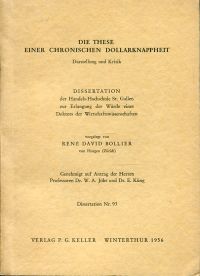 Bollier, René David: Die These einer chronischen Dollarknappheit. Darstellung und Kritik. Winterthur: P.G. Keller 1956. 8°. XVIII, 240 S., einige Figuren und Tabellen. broschiert (leicht angestaubt; gut erhalten) (=Dissertation der Handels-Hochschule St. Gallen 1956, Nr. 93)
