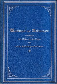 Wetzer, Leander von: Meinungen und Mahnungen. lose Blätter aus der Mappe eines alten kaiserlichen Soldaten. Wien, Seidel, 1893. 8°. 116 S., 2 lose Faksimile, Leinen mit umlaufendem Farbschnitt (Ex Libris auf Innendeckel; altersgemäss gut erhalten)