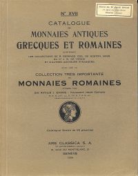Ars Classica. Catalogue N° XVII : Monnaies Antiques Grecques et Romaines contenant les collections de R. Burrage, du Dr. J. S. de Vienne et d’autres amateurs étrangers, ainsi que la collection très importante de Monnaies Romaines formée par Sir Arthur J. Evans. Vente aux Enchères publiques au 3 octobre 1934. Jacob Hirsch Expert. Genève: Ars Classica 1934. Lex.-8°. 2072 Nummern auf 142 S. 65 Lichtdrucktaf. Mit 2071 Abbildungen. Preisliste lose. Broschiert (altersgemäss leicht gebräunt; Besitzervermerk auf kleinem Kleber auf Umschlag vorne oben rechts; Ecken mit kleinen Gebrauchsspuren)