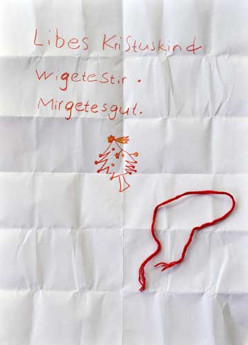 bildreich karten PK 872: vorweihnaechtliche kontaktaufnahme. Hochformat. (Brief, Kind, Dialog, Zeichnung, Schrift, Wolle, Band, Faden, Schnur, Falten, gefaltet, Papier, Advent, Christkind, Jesuskind)