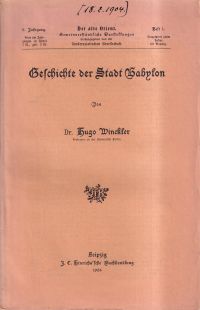 Winckler, Hugo: Geschichte der Stadt Babylon. Leipzig, J.C. Hinrichs, 1904. 8°. 47 S. Broschiert (altersgemäss gut erhalten) (=Der alte Orient, Jg. 6, H. 1) Text in Fraktur.